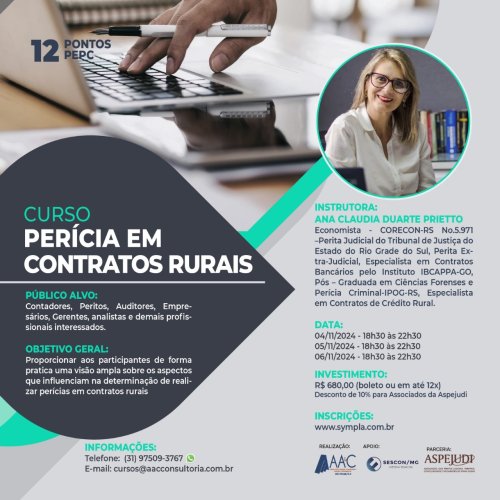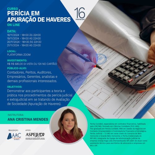 PERÍCIA EM DANOS MATERIAIS, ESCOLHA CONSENSUAL DO PERITO(A) E PERÍCIA EM LIQUIDAÇÃO DE SENTENÇA Inscrições abertas para o curso a distância. |