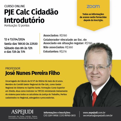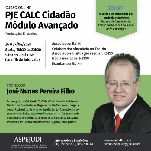 CURSO PJE - CÁLCULO CIDADÃO AVANÇADO Foi realizado pela Aspejudi, on line, de 19 a 23 de outubro/2021 (...) |